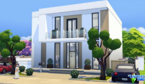 Maison basegame contemporaine réalisée pour Newcrest, grande pièce de vie au rez-de-chaussée, 2 chambres, 1 salle de bains, 1 salle d'eau à l'étage. Jardin aménagé + psicine.  No CC.
