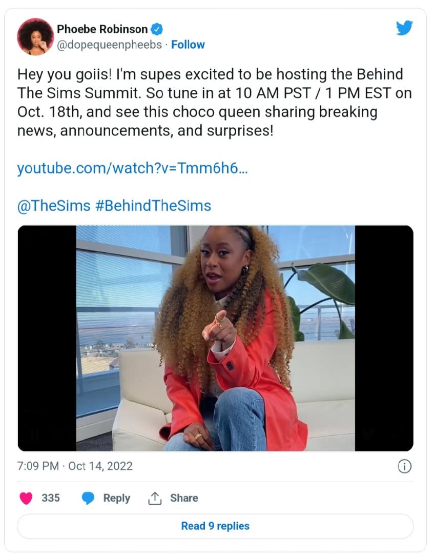 Phoebe Robinson, comédienne américaine, écrivaine à succès du New York Times et actrice a annoncé qu'elle animera le Behind The Sims lors d'une vidéo qu'elle a postée sur Twitter. On y voit également un aperçu de l'endroit où ils ont filmé l'événement !