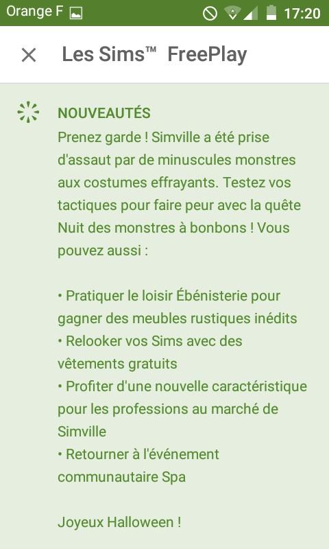 Capture d'écran du descriptif de la mise-à-jour d'Halloween des Sims FreePlay, dans le Play Store (Androïd).