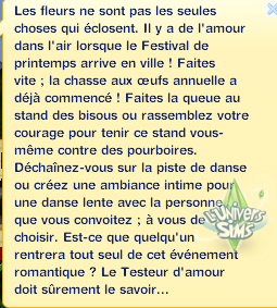 Quoi qu'il en soit, vous trouverez sur ce festival de printemps de jolis oeufs multicolores que vos sims pourront ramasser.