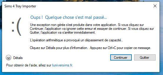 Bonjour , Impossible de récupérer les cc depuis la mise à jour des sims4 du 25 février. Avez-vous une solution? ************** Texte de l'exception ************** System.OverflowException: L'opération arithmétique a provoqué un dépassement de capacité. à Sims4.UserData.TrayContentFile.Open(String filename) à Sims4.UserData.TrayContentFileAll.FromTrayItem(TrayItem trayitem) à Sims4TrayImporter.CCTracking.CCFilter.set_TrayItem(TrayItem value) à Sims4TrayImporter.Controls.CCFileView.set_SelectedItem(TrayItem value) à Sims4TrayImporter.MainForm.ToggleItemCommandsEnabled(Boolean activate) à Sims4TrayImporter.Controls.EventDelayer.<>c__DisplayClass5_0.<DelayEvent>b__0(Object o, EventArgs e) à System.Windows.Forms.Timer.OnTick(EventArgs e) à System.Windows.Forms.Timer.TimerNativeWindow.WndProc(Message& m) à System.Windows.Forms.NativeWindow.Callback(IntPtr hWnd, Int32 msg, IntPtr wparam, IntPtr lparam) ************** Assemblys chargés ************** mscorlib Version de l'assembly : 4.0.0.0 Version Win32 : 4.8.9290.0 built by: NET481REL1LAST_C CodeBase : file:///C:/Windows/Microsoft.NET/Framework64/v4.0.30319/mscorlib.dll ---------------------------------------- S4TI Version de l'assembly : 1.0.0.0 Version Win32 : 1.23.03.0 CodeBase : file:///E:/Utilisateurs/Sims 4 Tray Importer (S4TI)/S4TI_x64.exe ---------------------------------------- System.Windows.Forms Version de l'assembly : 4.0.0.0 Version Win32 : 4.8.9251.0 built by: NET481REL1LAST_C CodeBase : file:///C:/WINDOWS/Microsoft.Net/assembly/GAC_MSIL/System.Windows.Forms/v4.0_4.0.0.0__b77a5c561934e089/System.Windows.Forms.dll ---------------------------------------- System Version de l'assembly : 4.0.0.0 Version Win32 : 4.8.9282.0 built by: NET481REL1LAST_C CodeBase : file:///C:/WINDOWS/Microsoft.Net/assembly/GAC_MSIL/System/v4.0_4.0.0.0__b77a5c561934e089/System.dll ---------------------------------------- System.Drawing Version de l'assembly : 4.0.0.0 Version Win32 : 4.8.9037.0 built by: NET481REL1 CodeBase : file:///C:/WINDOWS/Microsoft.Net/assembly/GAC_MSIL/System.Drawing/v4.0_4.0.0.0__b03f5f7f11d50a3a/System.Drawing.dll ---------------------------------------- System.Configuration Version de l'assembly : 4.0.0.0 Version Win32 : 4.8.9037.0 built by: NET481REL1 CodeBase : file:///C:/WINDOWS/Microsoft.Net/assembly/GAC_MSIL/System.Configuration/v4.0_4.0.0.0__b03f5f7f11d50a3a/System.Configuration.dll ---------------------------------------- System.Core Version de l'assembly : 4.0.0.0 Version Win32 : 4.8.9297.0 built by: NET481REL1LAST_C CodeBase : file:///C:/WINDOWS/Microsoft.Net/assembly/GAC_MSIL/System.Core/v4.0_4.0.0.0__b77a5c561934e089/System.Core.dll ---------------------------------------- System.Xml Version de l'assembly : 4.0.0.0 Version Win32 : 4.8.9037.0 built by: NET481REL1 CodeBase : file:///C:/WINDOWS/Microsoft.Net/assembly/GAC_MSIL/System.Xml/v4.0_4.0.0.0__b77a5c561934e089/System.Xml.dll ---------------------------------------- TeameeVo.Import Version de l'assembly : 1.0.0.0 Version Win32 : 1.0.0.0 CodeBase : file:///E:/Utilisateurs/Sims 4 Tray Importer (S4TI)/TeameeVo.Import.DLL ---------------------------------------- Sims4.GameInfo Version de l'assembly : 1.0.6.0 Version Win32 : 1.0.6.0 CodeBase : file:///E:/Utilisateurs/Sims 4 Tray Importer (S4TI)/Sims4.GameInfo.DLL ---------------------------------------- Sims4.Common Version de l'assembly : 1.0.6.0 Version Win32 : 1.0.6.0 CodeBase : file:///E:/Utilisateurs/Sims 4 Tray Importer (S4TI)/Sims4.Common.DLL ---------------------------------------- S4TI.LocaleManager Version de l'assembly : 1.0.0.0 Version Win32 : 1.0.0.0 CodeBase : file:///E:/Utilisateurs/Sims 4 Tray Importer (S4TI)/S4TI.LocaleManager.DLL ---------------------------------------- TeameeVo.Common Version de l'assembly : 1.0.0.0 Version Win32 : 1.1.3.0 CodeBase : file:///E:/Utilisateurs/Sims 4 Tray Importer (S4TI)/TeameeVo.Common.DLL ---------------------------------------- S4TI.resources Version de l'assembly : 1.0.0.0 Version Win32 : 1.23.03.0 CodeBase : file:///E:/Utilisateurs/Sims 4 Tray Importer (S4TI)/fr/S4TI.resources.DLL ---------------------------------------- Sims4.UserData Version de l'assembly : 1.0.0.0 Version Win32 : 1.0.0.0 CodeBase : file:///E:/Utilisateurs/Sims 4 Tray Importer (S4TI)/Sims4.UserData.DLL ---------------------------------------- mscorlib.resources Version de l'assembly : 4.0.0.0 Version Win32 : 4.8.9037.0 built by: NET481REL1 CodeBase : file:///C:/WINDOWS/Microsoft.Net/assembly/GAC_MSIL/mscorlib.resources/v4.0_4.0.0.0_fr_b77a5c561934e089/mscorlib.resources.dll ---------------------------------------- System.Xml.Linq Version de l'assembly : 4.0.0.0 Version Win32 : 4.8.9037.0 built by: NET481REL1 CodeBase : file:///C:/WINDOWS/Microsoft.Net/assembly/GAC_MSIL/System.Xml.Linq/v4.0_4.0.0.0__b77a5c561934e089/System.Xml.Linq.dll ---------------------------------------- System.Windows.Forms.resources Version de l'assembly : 4.0.0.0 Version Win32 : 4.8.9037.0 built by: NET481REL1 CodeBase : file:///C:/WINDOWS/Microsoft.Net/assembly/GAC_MSIL/System.Windows.Forms.resources/v4.0_4.0.0.0_fr_b77a5c561934e089/System.Windows.Forms.resources.dll ---------------------------------------- Sims4.CSharp Version de l'assembly : 1.0.0.0 Version Win32 : 1.95.0.0 CodeBase : file:///E:/Utilisateurs/Sims 4 Tray Importer (S4TI)/Sims4.CSharp.DLL ---------------------------------------- ProtoBuffer Version de l'assembly : 1.0.0.0 Version Win32 : 1.0.0.0 CodeBase : file:///E:/Utilisateurs/Sims 4 Tray Importer (S4TI)/ProtoBuffer.DLL ---------------------------------------- Microsoft.Web.WebView2.Core Version de l'assembly : 1.0.1587.40 Version Win32 : 1.0.1587.40 CodeBase : file:///E:/Utilisateurs/Sims 4 Tray Importer (S4TI)/Microsoft.Web.WebView2.Core.DLL ---------------------------------------- Microsoft.Web.WebView2.WinForms Version de l'assembly : 1.0.1587.40 Version Win32 : 1.0.1587.40 CodeBase : file:///E:/Utilisateurs/Sims 4 Tray Importer (S4TI)/Microsoft.Web.WebView2.WinForms.DLL ------------