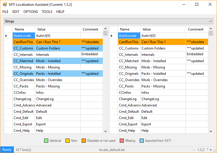 Français (see English description at bottom or use Google ) Fichiers de traduction pour la version 1.4.4 : s4ti_translation_144.zip (2016-08-16) Note: Obsolète, les traductions sont maintenant importées depuis Tray Importer! Contient toutes les traductions actuellement disponible dans S4TI. Assistant de traduction : S4TI_LocaleAssistant_180713.zip (ancienne version! 2018-07-13) Note: Déjà inclus dans S4TI 1.9.2.7+ ! 2018-07-13 - Correction de plusieurs petits bogues. - Amélioré la performance lorsque la fenêtre est redimensionnée manuellement. - Correction du chargement des fichiers dont certaines valeurs ou commentaires contiennent '[' ou ']'. - Remplacer les couleurs par des plus pâles pour améliorer la lisibilité. 2017-06-21 - Permet d'importer à partir de l'une des langues pré installées lors d'un nouveau projet. 2017-02-22 - Corrigé le chargement des nouvelles entrées qui ne fonctionnait plus avec la dernière version de S4TI. - Par défaut, définit la langue pour les nouvelles traductions sur la langue actuellement installée. 2017-01-01 - Mise à jour du modèle 1.4.9 - Importe les nouvelles entrées depuis S4TI si installé. - Ajouté l'index des couleurs. Comparer les changements et identifier ce qui n'est pas traduit. - Cliquer sur une cellule pour modifier la valeur. (seulement à droite) - Utiliser OUTILS>Migrer pour migrer une ancienne traduction vers la dernière version. (recommandé uniquement pour les versions inférieures à 1.4) - Cliquer sur le nom de l'auteur (en bas à droite) pour changer le nom de l'auteur. Index des couleurs : - Orange : déprécié ou non utilisé - Jaune : absent (nouvelle valeur) - Vert : identique - Rouge : trouvé seulement à droite - Bleu : importé depuis S4TI Note: Depuis la version 1.4.4 de Tray Importer, il est maintenant possible d'importer des modifications ou d'ajouter une nouvelle langue. Aller dans OPTIONS>Langue>Ajouter une langue pour mettre à jour ou ajouter une langue à l'application. English Translation files for version 1.4.4 : s4ti_translation_144.zip (2016-08-16) Note: No longer needed, translations are now imported from Tray Importer! Contains all the translations currently available in S4TI. Localization Assistant : S4TI_LocaleAssistant_180713.zip (old version! 2018-07-13) Note: Now part of S4TI 1.9.2.7+! 2018-07-13 - Fixed some small bugs. - Improved performance when the window is resized manually. - Fixed loading of files whose values or comments contain '[' or ']'. - Replaced colors with lighter ones to improve readability. 2017-06-21 - Allows to import from any builtin languages while creating a new project. 2017-02-22 - Fixed importing new entries, that was no longer working since lastest S4TI version. - Now set new translation language to the one currently installed on your system by default. 2017-01-01 - Updated template to 1.4.9 - Import new entries from S4TI if installed. - Added color index. Compare what has changed and find which parts are not translated. - Click on each cells to edit values. (only on right side) - Use TOOLS>Migrate to upgrade an older translation to the latest version. (only needed for versions prior to 1.4.0) - Click on author name (at bottom right) to change the author name. Color index : - Orange : obsolete or not used - Yellow : missing (new value) - Green : same value - Red : only found on right side - Blue : imported from S4TI Note: Since Tray Importer version 1.4.4, it's possible to import changes from an existing translation or to add a new one. Go to OPTIONS>Language>Add Language to update or add a new language to the app. If you also wish to translate the installer: [CustomMessages] AppComment =Import/Export the content of your Sims 4 library. OpenAppWebPage =Open application homepage VerIcon =Search for Update SupportIcon =Support CreateDesktopIconMe =For me only CreateDesktopIconAll =For all users LogIcon =ChangeLog.txt CreateLogIcon =Create a shortcut for &ChangeLog.txt in Start Menu DOTNETNotInstalled =Microsoft .Net Framework 4.5.2 or better is not installed.%n%nMicrosoft .Net Framework is required to run this application.%nDownload latest version here:%nhttps://dotnet.microsoft.com/download%nSee download page for more info:%n{#MyAppURL} DOTNETNotInstalledXP =Microsoft .Net Framework 4.0 or better is not installed.%n%nMicrosoft .Net Framework is required to run this application.%nSee download page for more info:%n{#MyAppURL} VersionCheck =A new version could be available at '{#MyAppURL}'.%n%nCheck for Update now? AutoDetect =Auto Detect StandardInstall =Standard Installation LegacyInstall =Legacy Installation X64Bit = - 64-bit -
